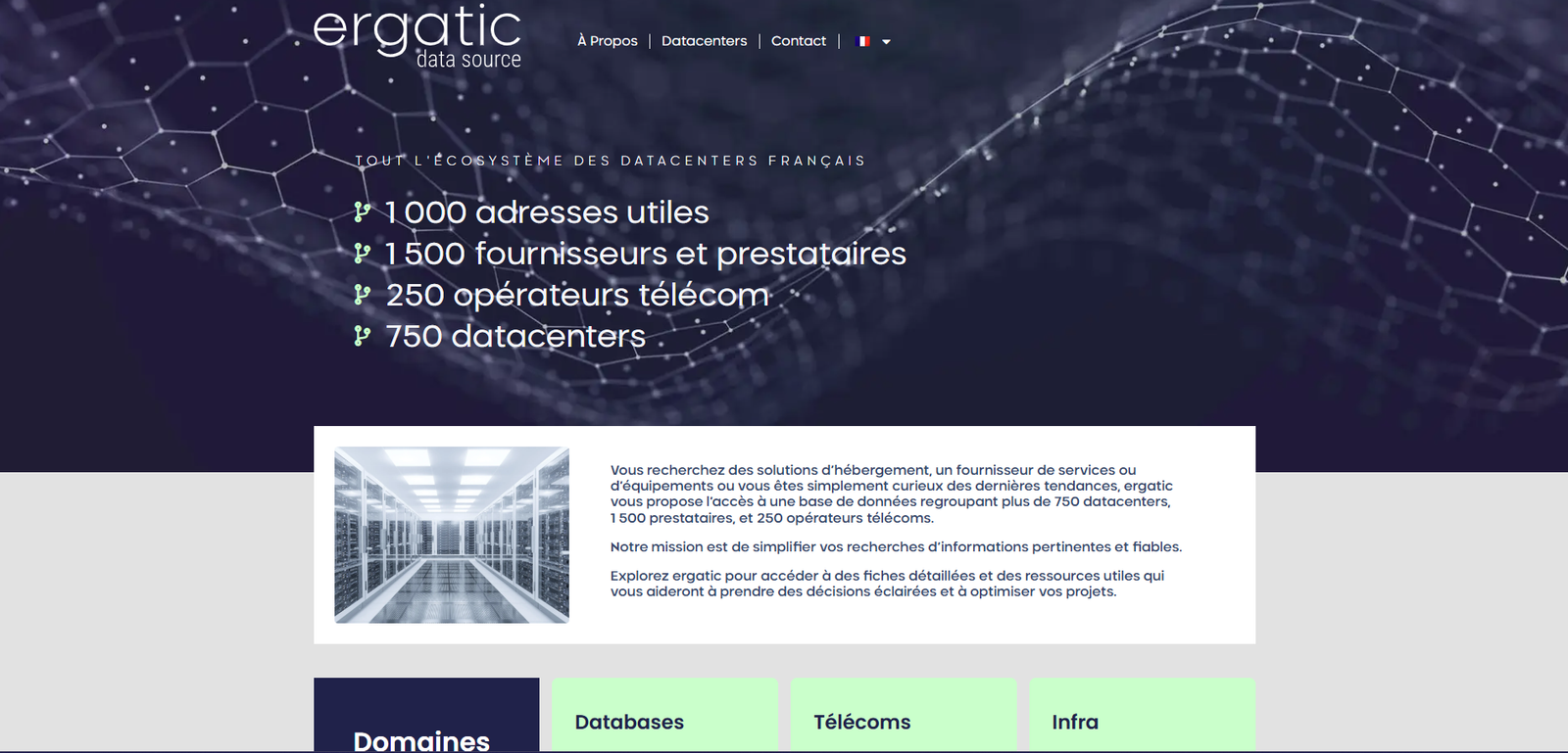 Défi : Construire un portail annuaire regroupant l’intégralité de l’écosystème des datacenters français — 750 datacenters, 1 500 fournisseurs, 1 000 adresses utiles, 250 opérateurs télécom — avec des fiches détaillées et des filtres avancés par domaine.