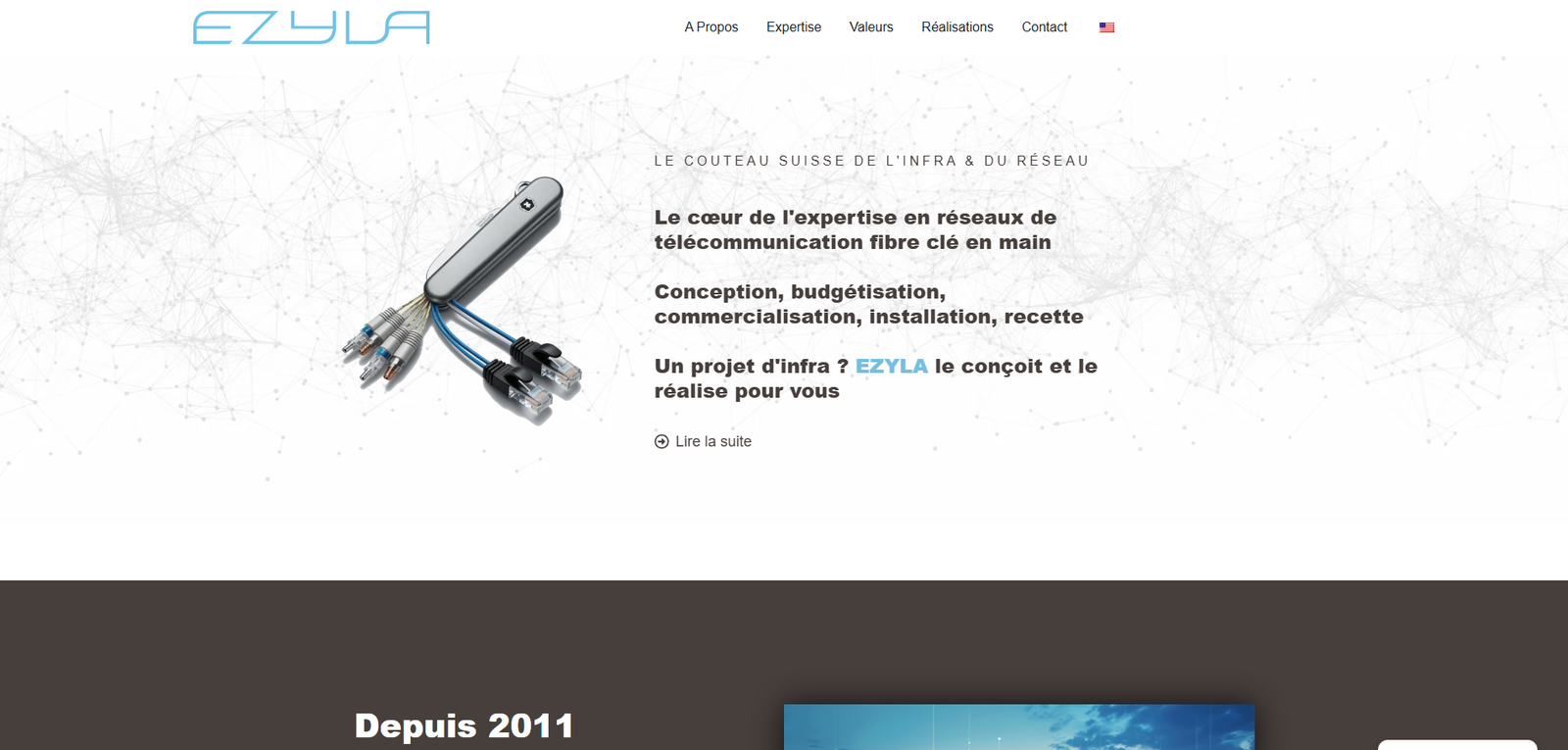 Solution : Site corporate avec architecture de contenu par expertise, présentation des réalisations, navigation épurée valorisant le positionnement « couteau suisse de l’infra & du réseau ».