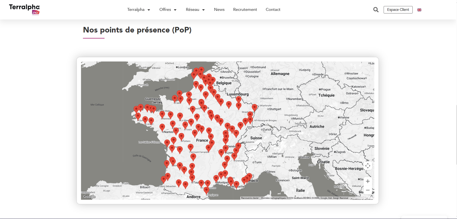 Solution : Site corporate bilingue pour une filiale de SNCF Réseau, avec cartographie dynamique du réseau, espace client dédié, architecture de contenu structurée par offre (TerraWave, TerraSpectrum, TerraPoP).